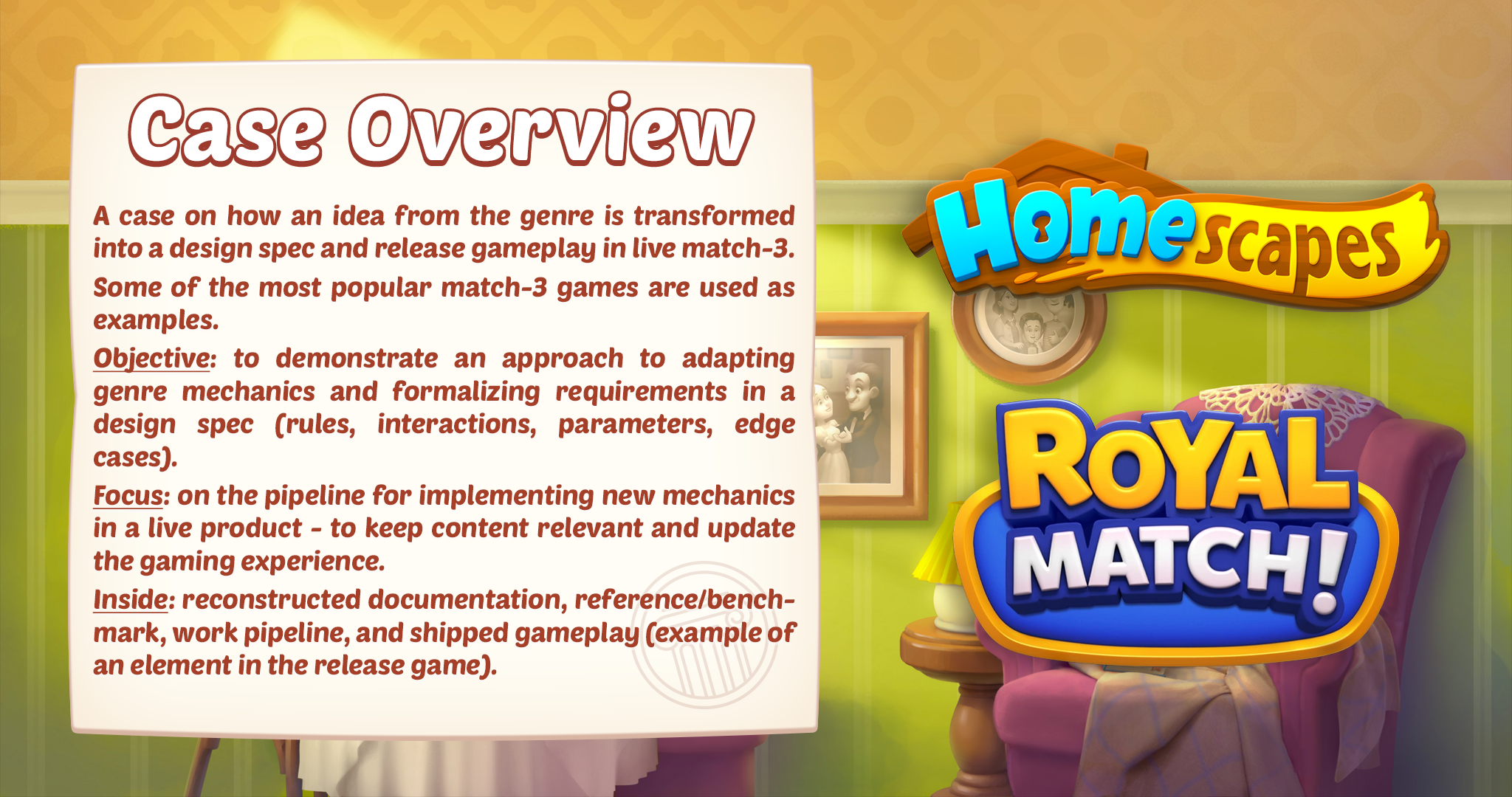 This project demonstrates the complete cycle of introducing a new element into a match-3 game: from the idea and reference to the result in the released game. A public example of a competitor's mechanics is used as a benchmark - it sets the initial principle of operation and the framework of expectations for perception. GDD of an element has been compiled: rules, damage, interactions with bonuses and other objects. The pipeline is described in a separate diagram: review, art production, prototyping, level testing, integration, QA, and refinement. The case concludes with shipped gameplay - a demonstration of how the element looks and plays. 🎮 My responsibilities: reference analysis and feature framing, defining the element ruleset (damage model, states, and interactions with boosters/objects), writing the GDD and updating it through iteration, coordinating with art and engineering to keep implementation aligned with the spec, validating the element through level testing and tuning, supporting QA with edge cases, repro steps, and final polish, preparing the shipped gameplay walkthrough/demo.