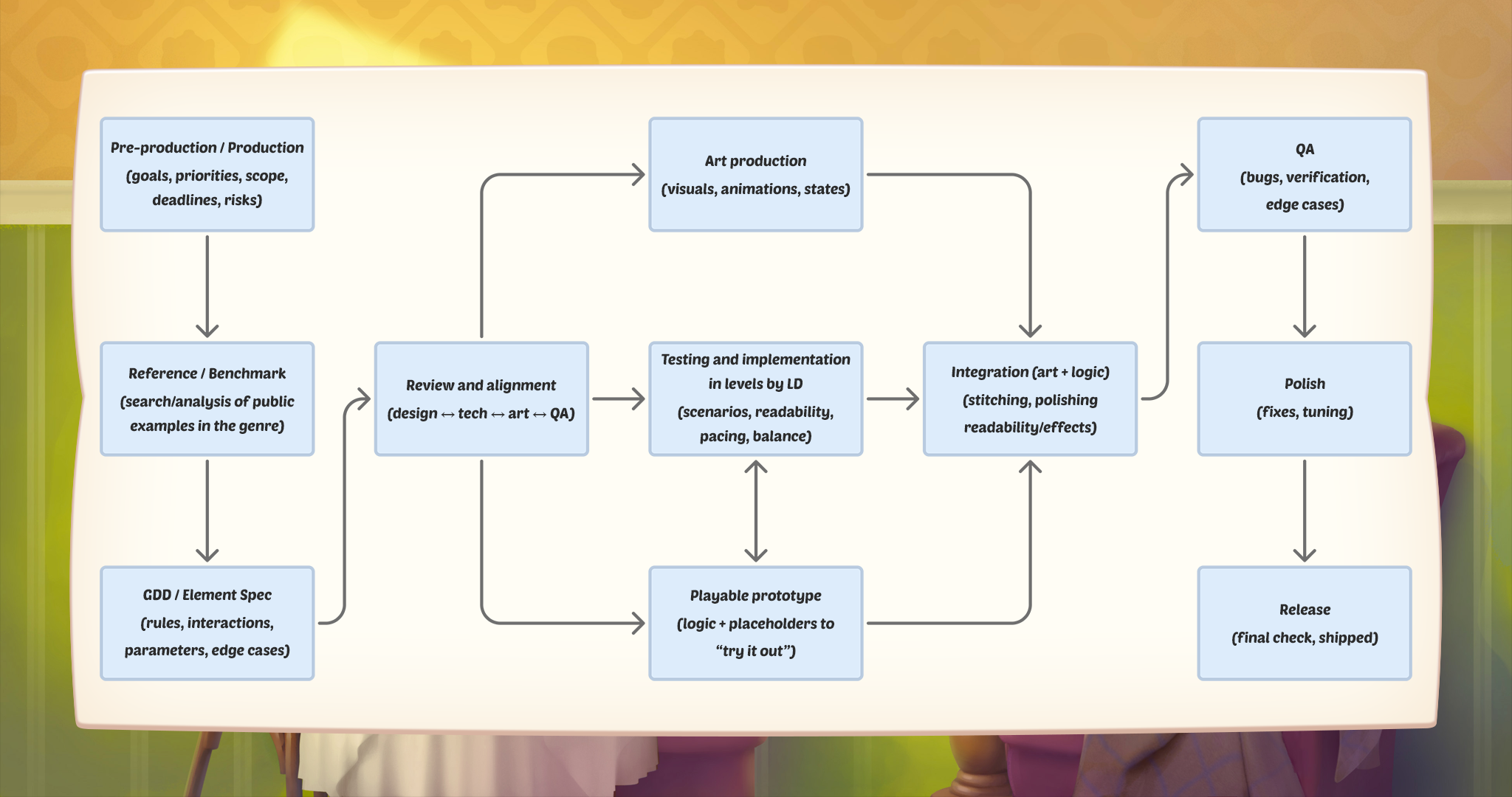 This project demonstrates the complete cycle of introducing a new element into a match-3 game: from the idea and reference to the result in the released game. A public example of a competitor's mechanics is used as a benchmark - it sets the initial principle of operation and the framework of expectations for perception. GDD of an element has been compiled: rules, damage, interactions with bonuses and other objects. The pipeline is described in a separate diagram: review, art production, prototyping, level testing, integration, QA, and refinement. The case concludes with shipped gameplay - a demonstration of how the element looks and plays. 🎮 My responsibilities: reference analysis and feature framing, defining the element ruleset (damage model, states, and interactions with boosters/objects), writing the GDD and updating it through iteration, coordinating with art and engineering to keep implementation aligned with the spec, validating the element through level testing and tuning, supporting QA with edge cases, repro steps, and final polish, preparing the shipped gameplay walkthrough/demo.
