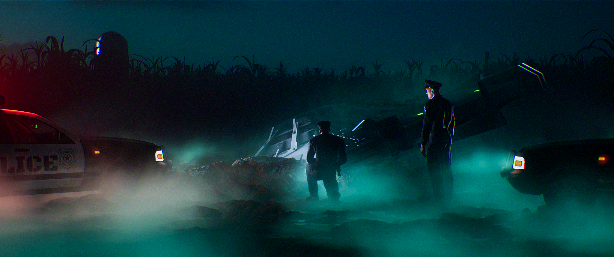 The X-Files is a short cinematic scene set in a stylized rural environment under a moonlit sky. The story unfolds through visual contrast and minimal dialogue, as two officers encounter a crashed alien craft in the middle of a cornfield. What begins as a quiet investigation slowly escalates into a surreal first-contact moment filled with tension, pulsing light, and atmospheric mystery. Built entirely in Unreal Engine 5 using Sequencer, the project focuses on environmental storytelling, cinematic pacing, and visual composition. The scene was finalized with post-processing and editing in DaVinci Resolve, highlighting a dramatic shift from cold moonlight to an overwhelming green glow that nearly fades to white — leaving the viewer with more questions than answers. 🎮 My responsibilities: environment design, lighting and color direction, camera setup, character animation, visual effects, post-processing, and full cinematic editing.